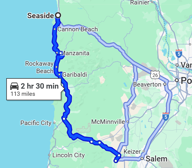 If you're coming directly from Portland, the classic coastal route is Highway 26 westbound through the Pacific Coast Range.