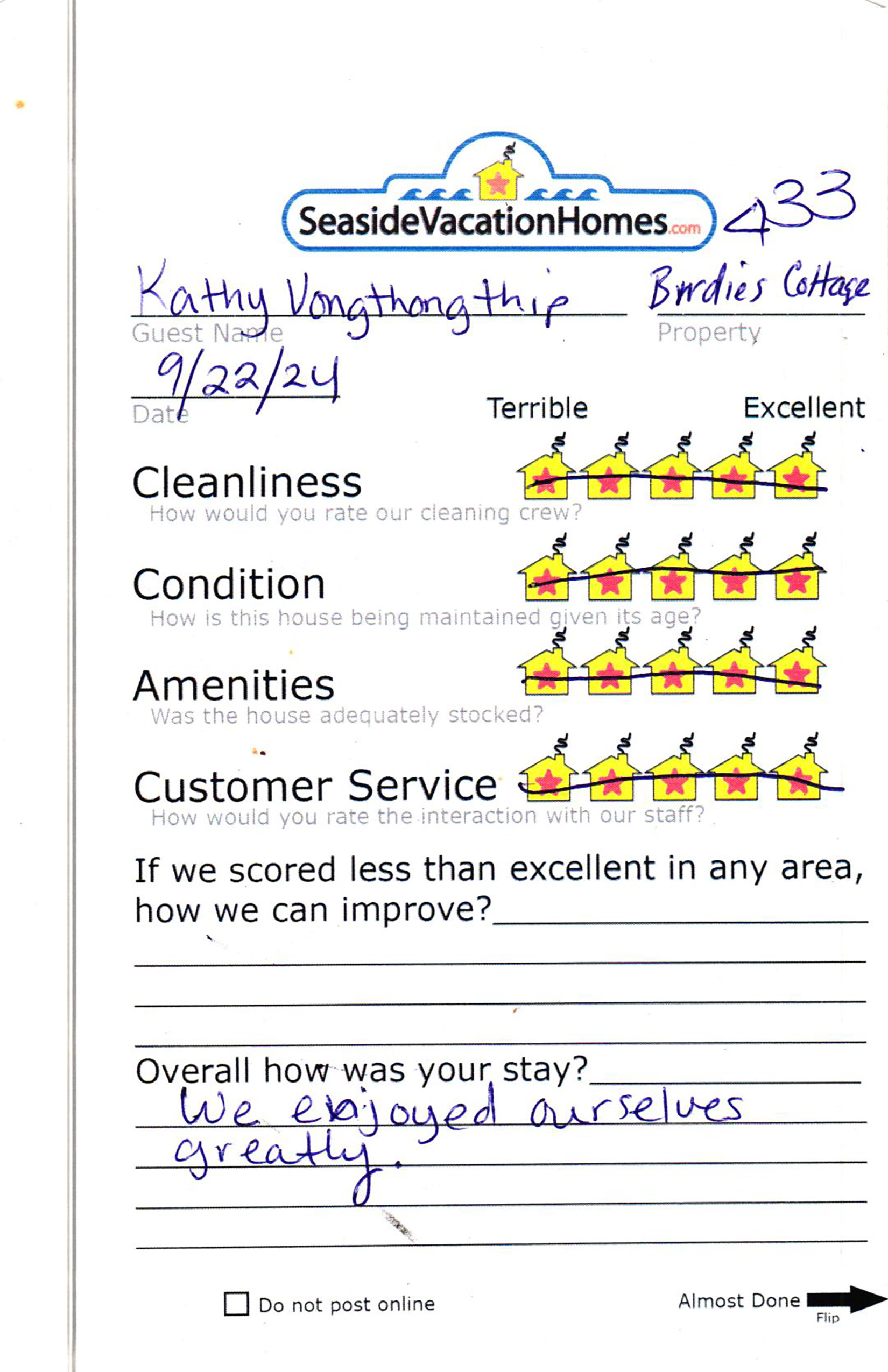 Example: "Is the balcony screened in?" or "Is there a toaster oven?"