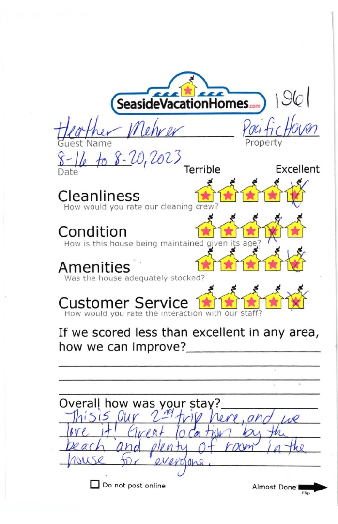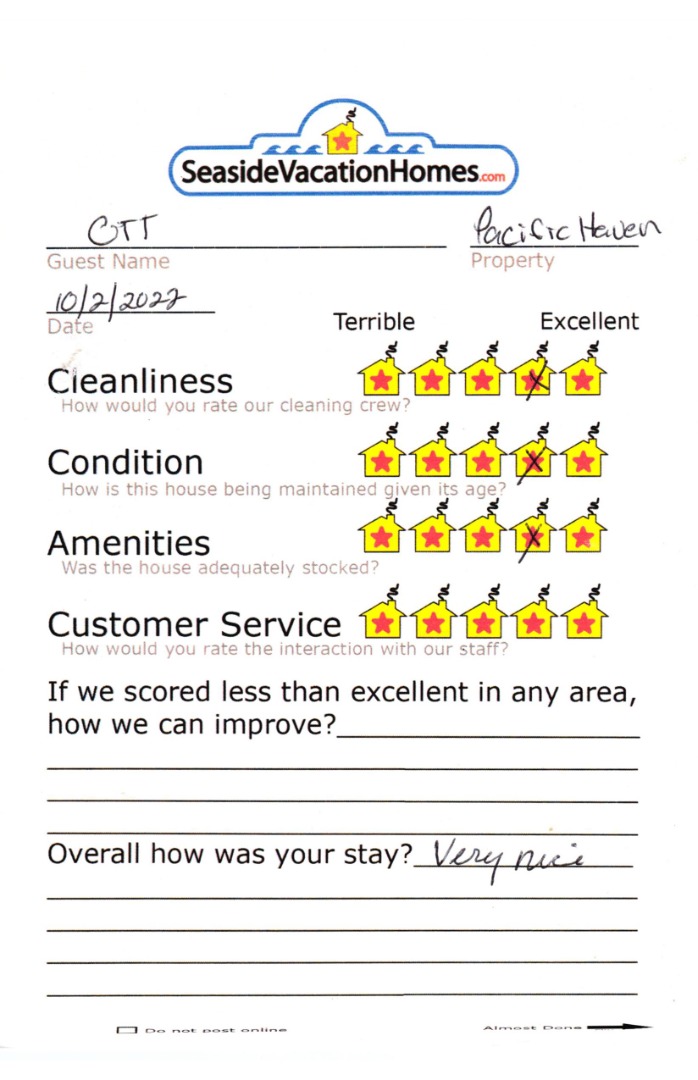 PACIFIC HAVEN, This Ocean Front Spacious three bedroom two and half bath home, features a large living room looking right out at the ocean. Make memories while watching the waves and enjoying this tastefully decorated beach-themed home. The large family room is set up to take in the waves with a large bayed picture window while watching that big game in the company of your entire group. The dining room has seating for the whole group to gather end enjoy meals together at the same time. All the bedrooms are located on the second floor featuring a large master bedroom with a king bed and its own private bath plus a nice comfortable chair you can sneak away to for a quiet place to read a book and enjoy the view of the ocean. The second bedroom features a king-size bed and a TV. The third bedroom is set up with two twin beds and a full-size bed. Now on to the basement, it is set up with a TV, a Foosball table, Air Hockey Table. Dogs welcome, sorry no cats allowed.