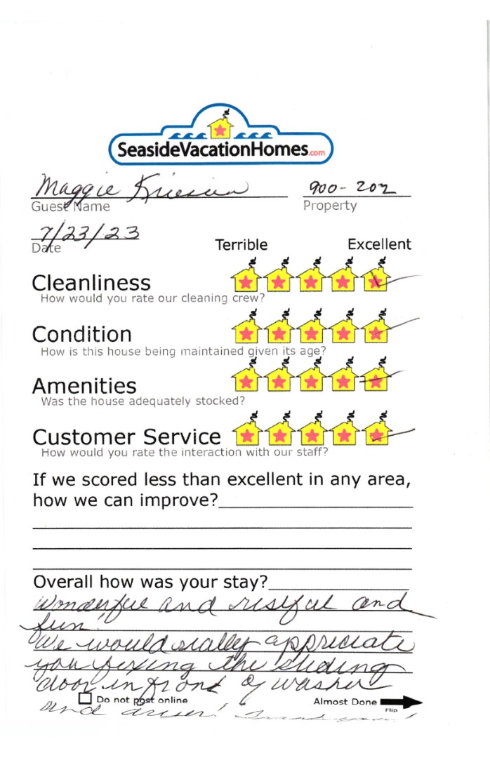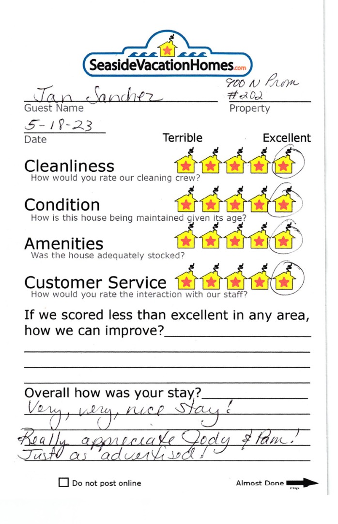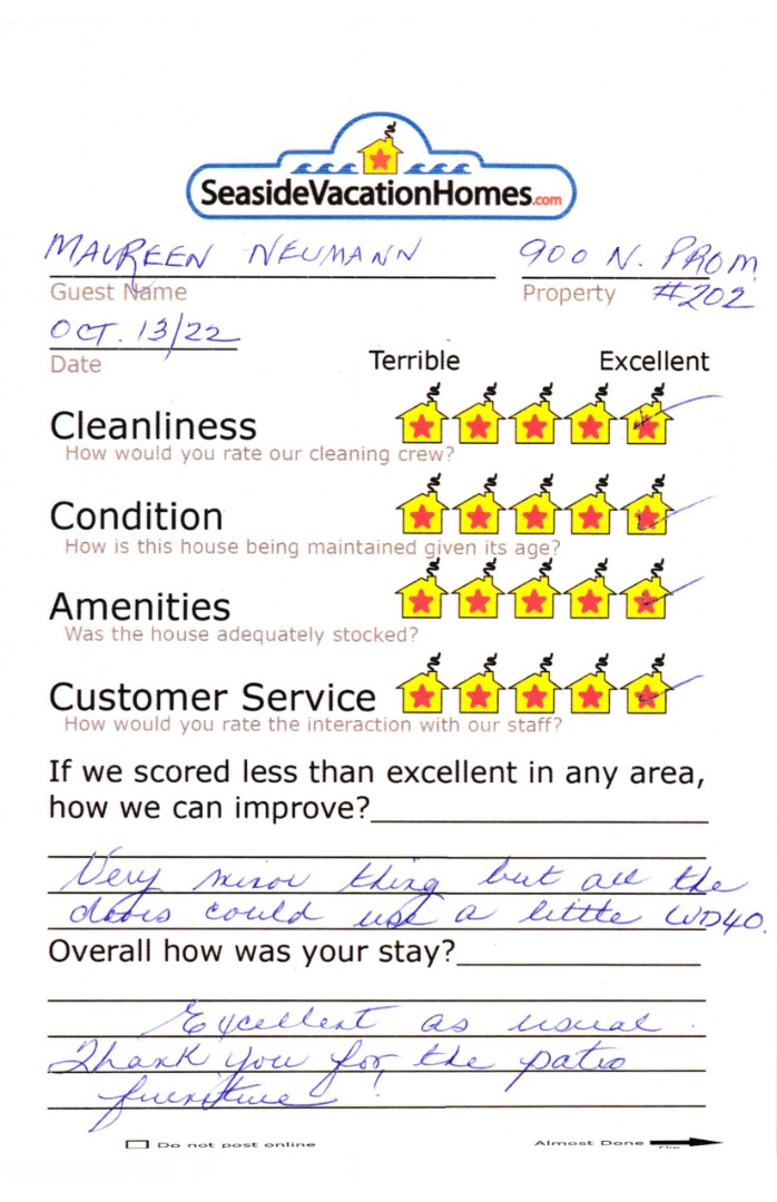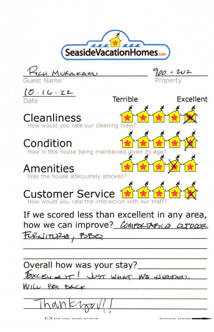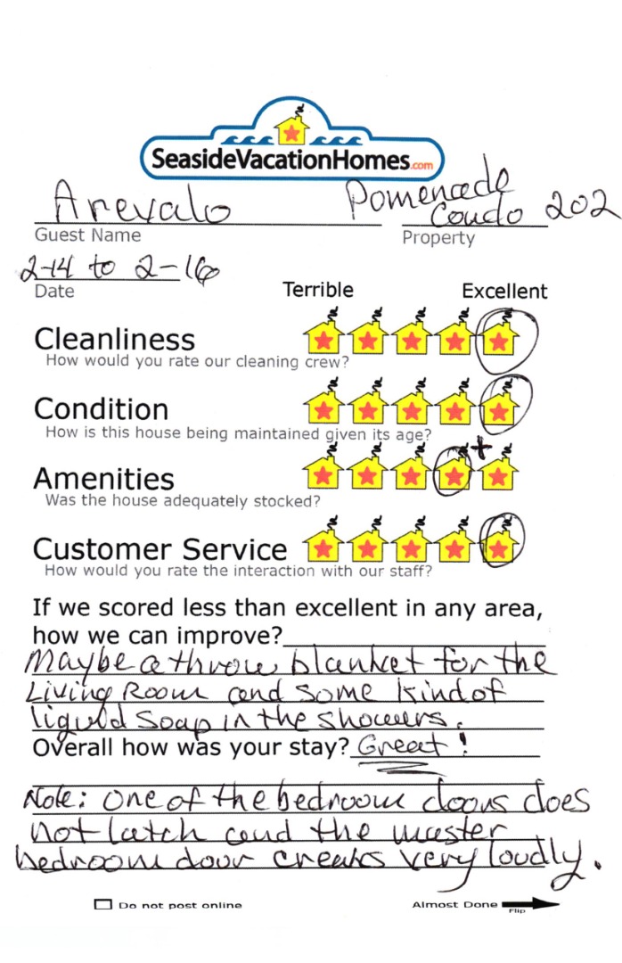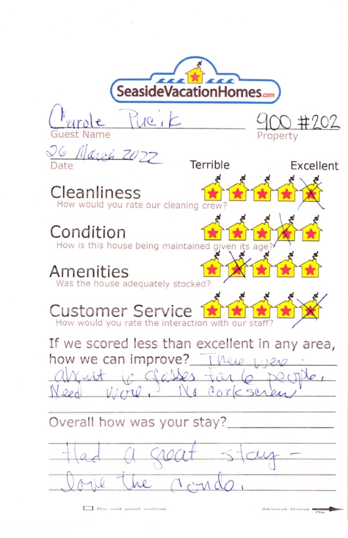 Example: "Is the balcony screened in?" or "Is there a toaster oven?"