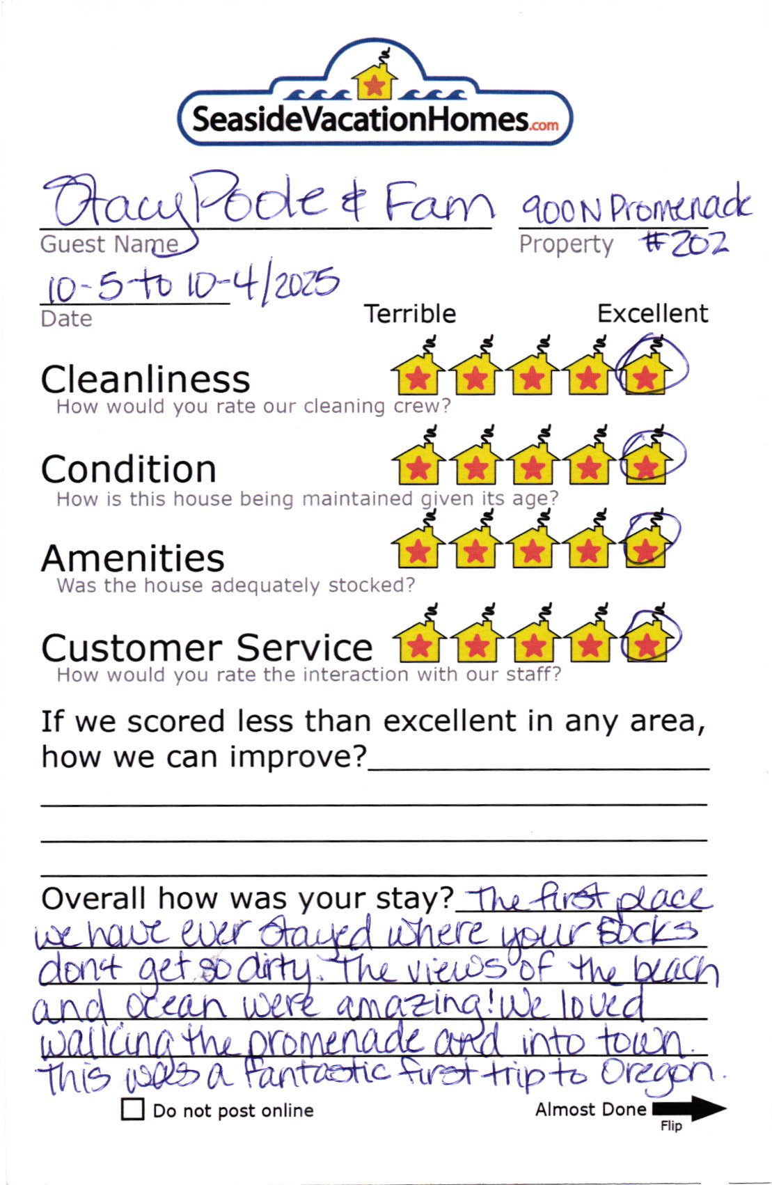 SEAVIEW GREAT ESCAPE at Seaside Beach: Seaview Condominiums is an ocean front luxury property in Seaside. This three bedroom oceanfront townhouse is located on the first and second floors, offering direct beach access from the home and giving guests a breathtaking view of the coastline stretching from Washington to Tillamook Head. The master suite has a Queen bed and it's own private bath. Another room has 2 twins and 1 has a queen bed. Upstairs has a day bed with a trundle that shares the office space. This home is located on the north end of the Prom and is an easy 10-minute walk to Broadway and all the dining and fun that downtown has to offer. Keep in mind the additional cleaning charge ensures that your house will be spotless upon arrival and that you will not be asked to spend more than 5 min on the check out procedure. See policies for more booking information.
