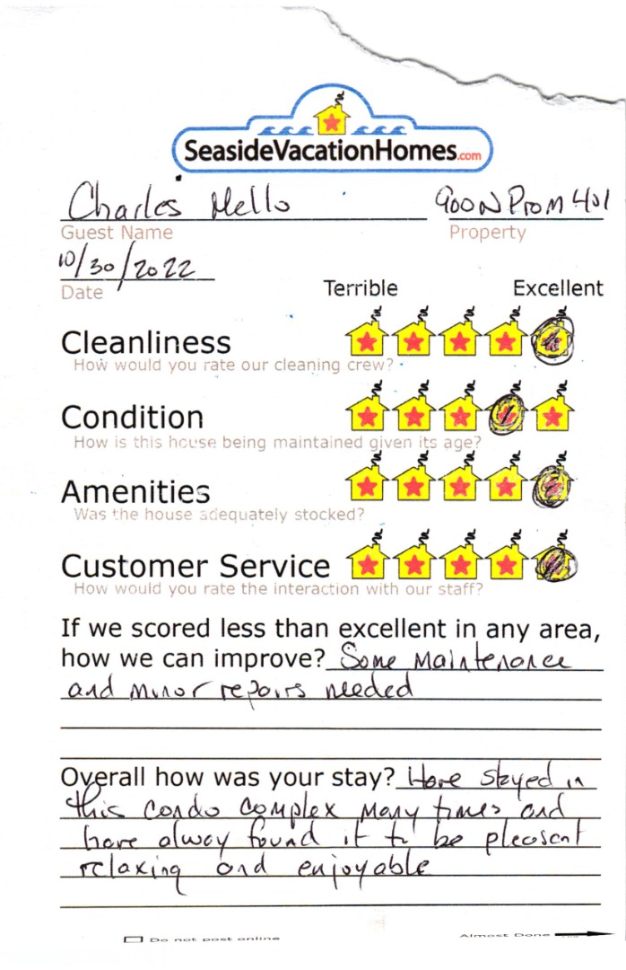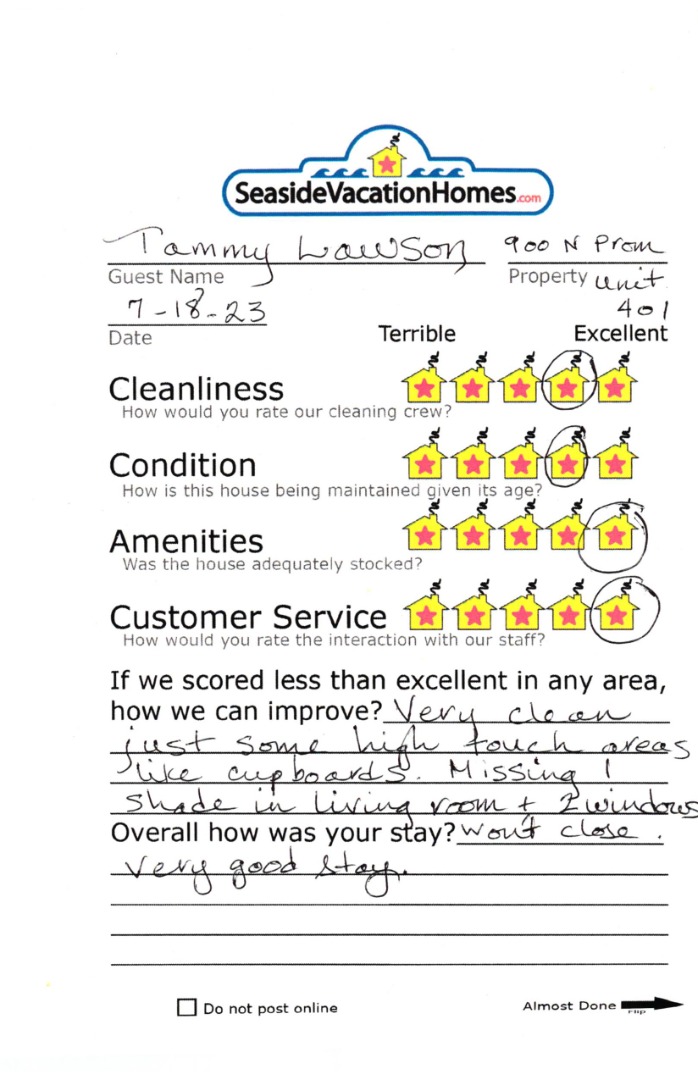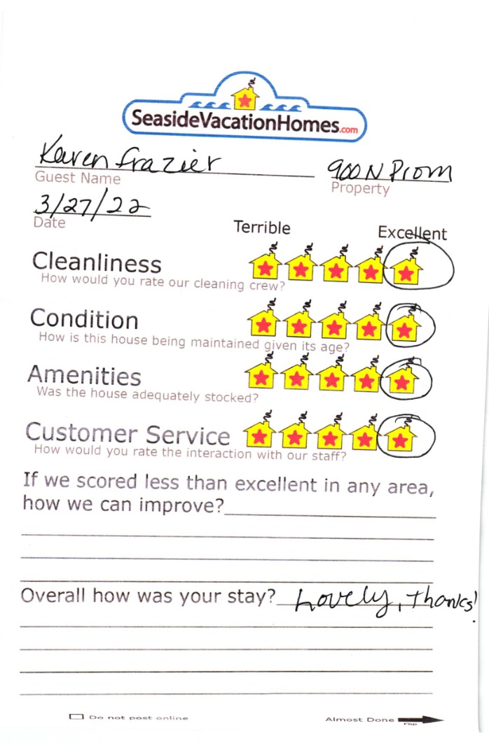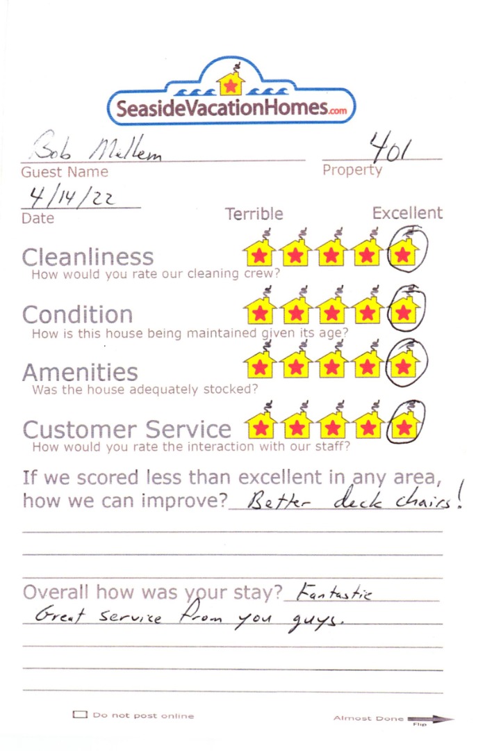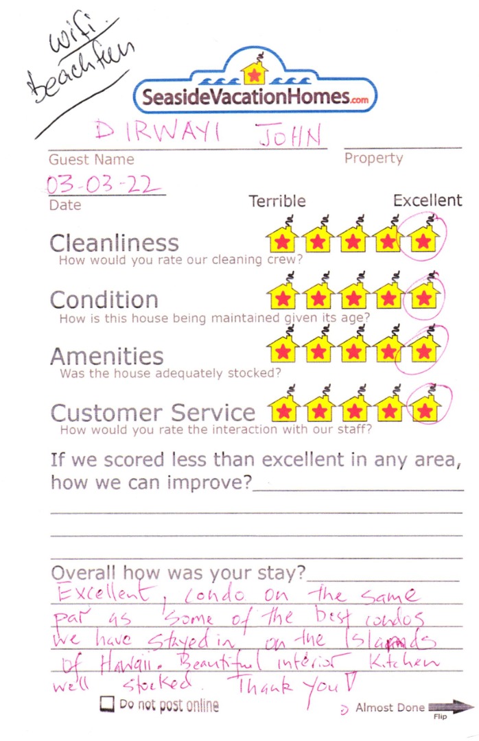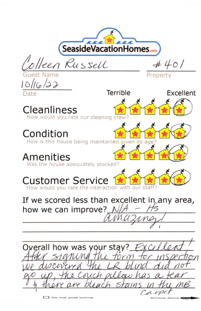 Example: "Is the balcony screened in?" or "Is there a toaster oven?"