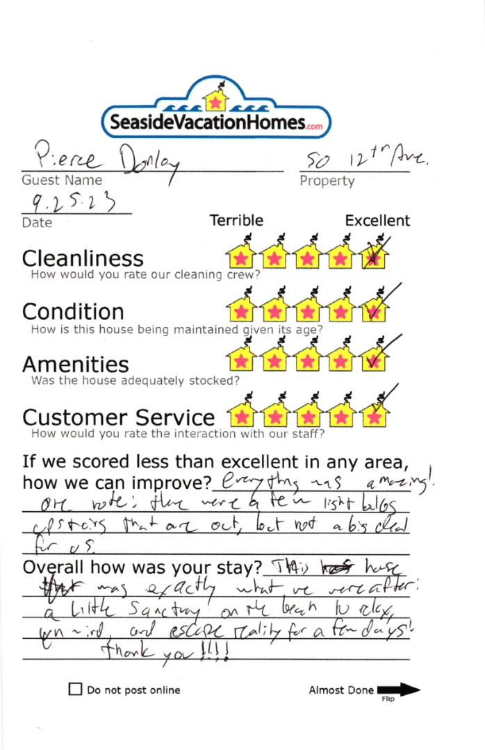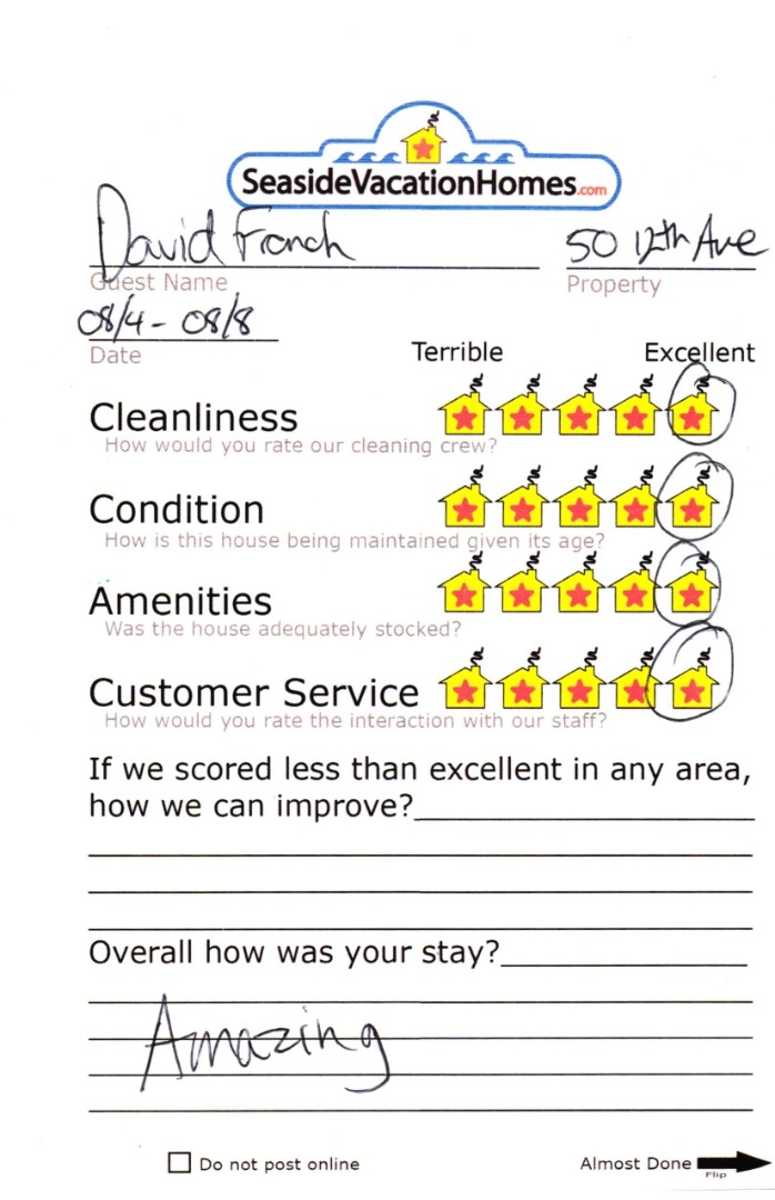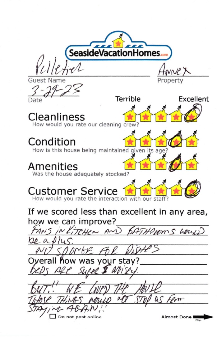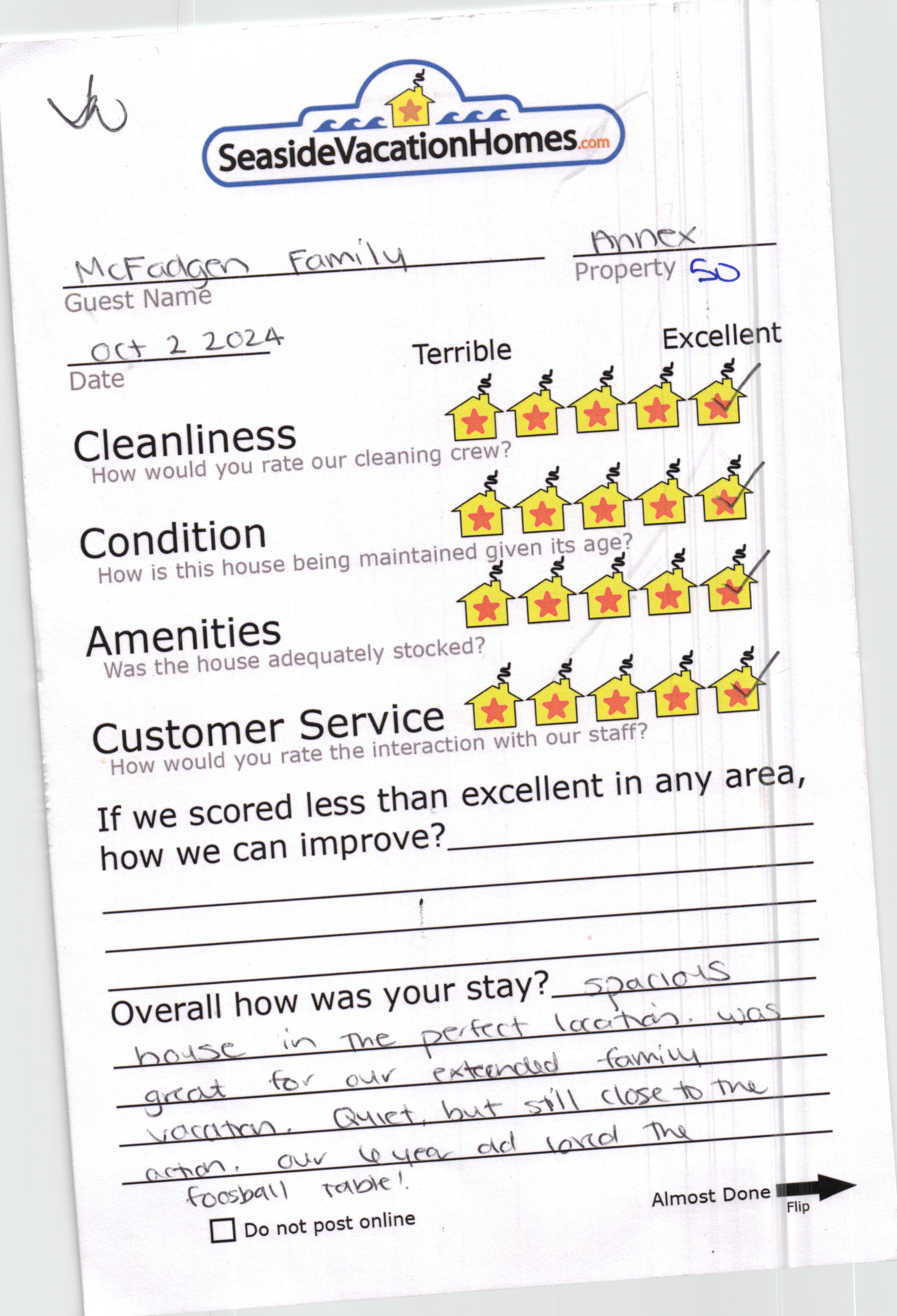 THE ANNEX at Seaside Beach: OCEAN FRONT is nestled on the edge of the sand dunes providing privacy and its own beach access. Just 50 feet from the north end of Seaside’s famous boardwalk, the Prom, sits this oceanfront home. At this location you can walk directly from the deck right to the sand dunes, ocean and beach. A ten-minute stroll will take you to the aquarium, Turnaround, downtown shops and restaurants. The two-story home is approximately 1800 square feet in size. The floor to ceiling picture windows and vaulted living room make it feel even bigger. A sun deck at the front of the home extends the living space outside. Two bedrooms and a bath are located on the main floor with one of the rooms furnished with a king bed and the other a queen. You can watch the activities on the beach from the living and dining rooms as well as the kitchen and upstairs loft. Expanded cable ensures you won`t miss any of your favorite programs when watching the large screen television. Upstairs is a family room equipped with a TV/VCR, games a foosball table, and a trundle bed. The large bedroom and bath on this floor has a queen bed, bunk beds and a twin bed to comfortably sleep four guests. There is parking for 2 vehicles on the property, one in the garage, and the other in front of the garage. The garage and parking pad in front of the garage is a shared space with the owner of the home, with the owner using one side, and the other side being designated for guests. Keep in mind the additional cleaning charge ensures that your house will be spotless upon arrival and that you will not be asked to spend more than 5 min on the check out procedure. See policies for more booking information.